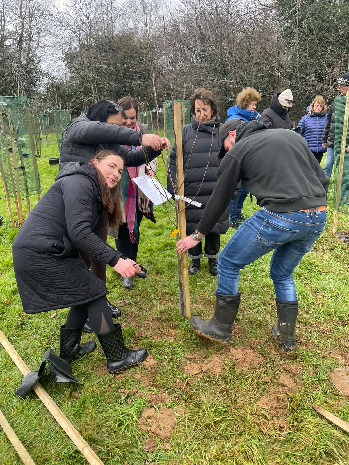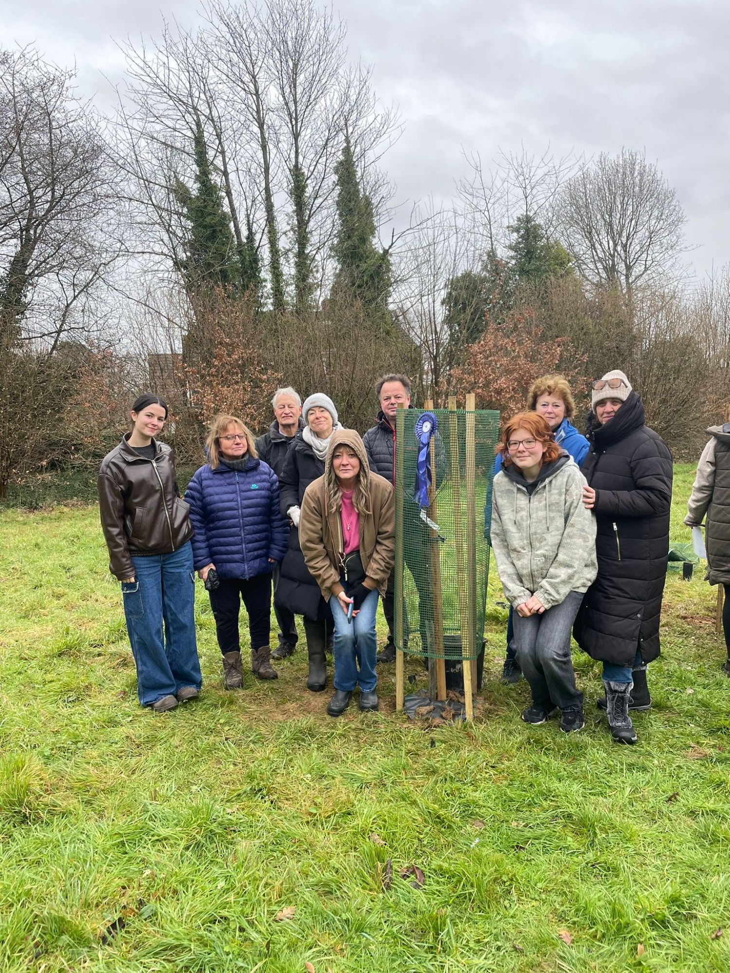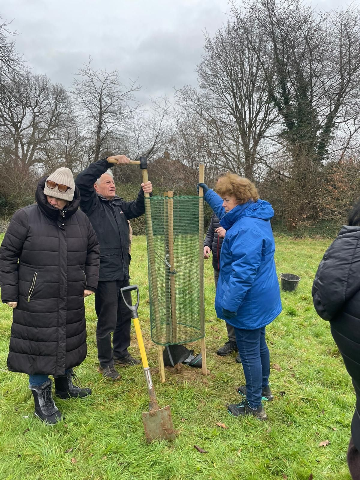 A hardy group braved the cold to plant 3 new apple trees and also to replace a cherry tree that did not survive the long hot summer